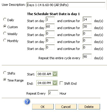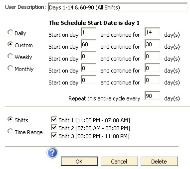 In the example below, titled Days 1-14 and 60-90, All Shifts, this custom schedule will turn the lights on starting of day 1, continuing for 14 more days. Then the kiosk lights will be off on days 16 through 59. On day 60, the lights will come back on and continue for 30 more days. On the example, the lights will come on for all three shifts, and there is no end date established, meaning the cycle will start again every 90 days.