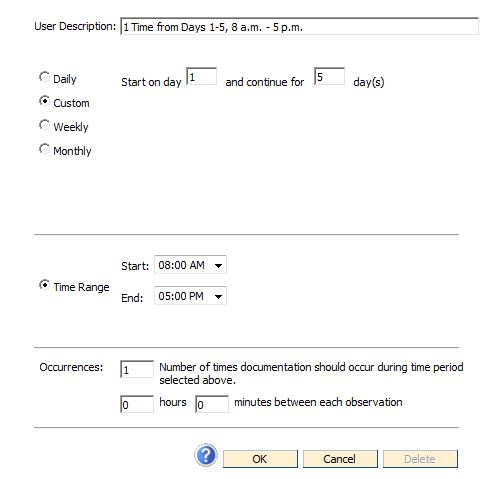 The Occurrences section of the window allows you to state the number of times documentation should occur during the time period you chose. To specify the amount of time that should lapse between each observation you can enter the total number of hours or minutes that you want to pass before documentation can occur again.